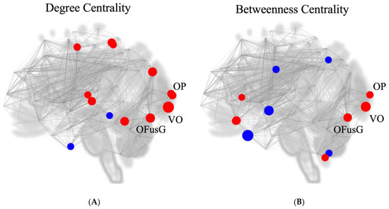 Location of putative hubs in the comparison between effortful breathing and normal respiration (effort breathing > normal respiration). (A) Degree centrality (two-sided); (B) betweenness centrality (two-sided). Abbreviation: l, left; r, right; OFusG, occipital fusiform gyrus; OP, occipital pole; VO, network’s visual occipital. Red circle shows positive centrality, while the blue circle reveals a negative one.
