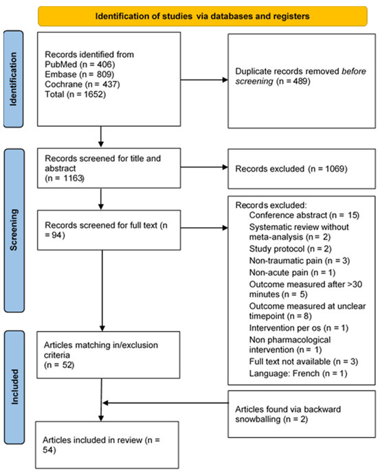 Eligibility criteria were defined using the PICO framework. The population consisted of adults receiving emergency care for acute (<48 h), moderate to severe (Numeric Rating Scale (NRS) ≥ 4 or Visual Analogue Scale (VAS) ≥ 40 mm), traumatic pain. The intervention consisted of parenteral, non-intravenous analgesia. A comparator was not defined. The outcome was pain intensity or safety. Studies were excluded if they did not present original data; were conference abstracts, case reports, or series; measured the first endpoint beyond 30 min; were not available in full text, or were written in a language other than English or Dutch.