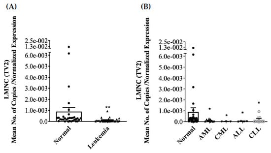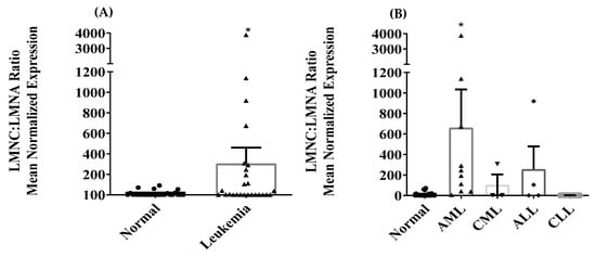 Comparison of the LMNC:LMNA mRNA ratio between normal and leukemic subjects in (A), and the LMNC:LMNA mRNA ratio in the same samples after stratification based on the four primary leukemias in (B). The error bars in the figure represent the mean ± S.E.M. Furthermore, the asterisk (*) indicates statistical significance with a p-value < 0.05.