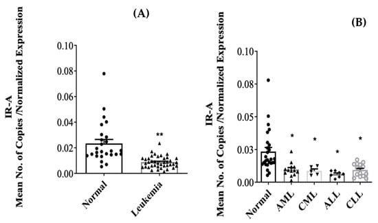 Normalized mRNA expression levels of IR-A in PBMC of both normal and leukemic subjects (A). The data are further categorized into normal and the four primary leukemic types (AML, CML, ALL, CLL) (B). The error bars in the graph represent the mean ± Standard Error of the Mean (S.E.M.). The significance of the results is indicated by the symbols ** (p < 0.001) and * (p < 0.05).