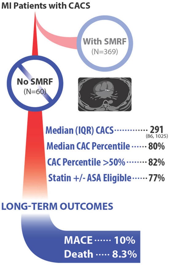 CAC scan results and outcomes in MI patients without SMRF. ASA = aspirin; CACS = coronary artery calcium scan; IQR = interquartile range; MACE = major adverse cardiovascular events; SMRF = standard modifiable risk factors. Outcomes were assessed at a mean of 2.2 years.