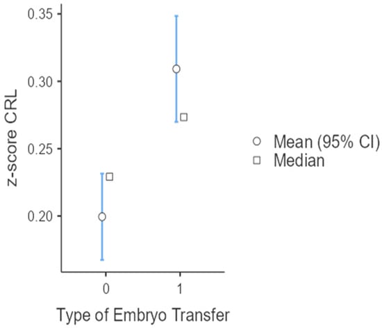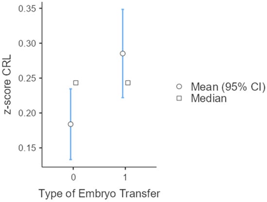 CRL z-scores according to type of embryo transfer in singleton gestations (0: fresh embryo transfer; 1: thawed embryo transfer).