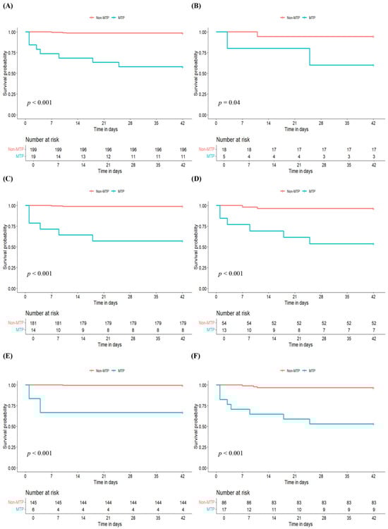 When patients were grouped based on their initial hemoglobin levels (g/dL), the MTP group demonstrated a higher 42-day mortality for those with initial hemoglobin levels < 6 g/dL (40.0% vs. 5.6%, log-rank p = 0.04, Figure 2B) and those with initial hemoglobin levels ≥ 6 g/dL (42.9% vs. 1.1%, log-rank p < 0.001, Figure 2C). When patients were stratified according to initial SBP, the MTP group showed higher 42-day mortality for patients with initial SBP < 100 mmHg (46.2% vs. 3.7%, log-rank p < 0.001, Figure 2D) and for patients with initial SBP ≥ 100 mmHg (33.3% vs. 0.7%, log-rank p < 0.001, Figure 2E). When stratified according to MELD score, the 42-day mortality was higher in the MTP group for patients with MELD score ≥ 13 (47.1% vs. 3.5%, log-rank p < 0.001, Figure 2F). Among patients with a MELD score < 13, only two patients received MTP. The failure to control the bleeding rate was also higher in the MTP group than in the non-MTP group in the subgroups analyzed (Table 2).