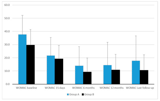 The mean follow-up was over 13 months and similar in both groups [Group A 13.6 ± 4.7 months versus Group B 14.9 ± 5.6 months, p = 0.254] (Table 1). The preintervention demographic data showed no statistically significant differences. Osteoarthritis grade and symptom scores were similar in both groups (Table 1). Throughout the follow-up, the symptom scores diminished in both groups, but a statistically significant difference was detected in WOMAC only at the last follow-up favoring Group B, the non-obese patients [Group A 17.8 ± 18.8 versus Group B 10.5 ± 11.7, p = 0.023] (Table 2, Figure 1). Furthermore, Group A had more arthroplasties than Group B, but this difference remained statistically insignificant. The odds ratio (OR) for total knee arthroplasty was 3.5 (95% CI 0.3–40.1, p = 0.553), and the OR for any arthroplasty was 7.5 (95% CI 0.8–69.8, p = 0.085). Group B experienced slightly more adverse events from the injections than Group A, but this finding was not statistically different (Table 2).