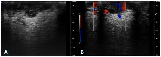 The high-frequency ultrasound (A) reveals an irregular localized thickened area within the oral mucosa presenting as a hypoechoic lesion. The lesion appears to have a slightly irregular surface with the normal free margin presenting as focally interrupted and is confined to the superficial layers of the mucosa. No infiltration into deeper tissues is noted, with globally deeper regular margins. Surrounding tissues show normal echogenicity with no evident signs of metastasis or structural abnormalities. In addition, Doppler signal analysis (B) reveals an increase in vascularity compared to normal tissues. Vascularity is notably peripheral, showing an increase in both arterial and venous components.