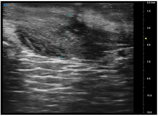 Oral soft tissue lesions were examined utilizing a 70 MHz “hockey stick” probe, which had been available at the institute since 2016. Each participant underwent an intraoral UHFUS examination using the Vevo® MD device from VisualSonics in Toronto, ON, Canada. Intraoral ultrasounds were conducted prior to biopsy by an experienced radiologist with over 10 years of experience in the field. The radiologist utilized a high-frequency “hockey stick” probe (22–28 MHz) covered with a sterile latex sheath. A small amount of ultrasound gel was placed inside the cover to create a distance between the probe and the mucosa, facilitating clear visualization of exophytic or ulcerated lesions. Gentle pressure was applied to minimize compression distortion of the lesion’s thickness and morphology. B-mode and C-mode acquisitions were conducted for each lesion using standardized presets, maintaining constant parameters such as gain, time gain compensation, dynamic range, mechanical index, and thermal index. The scan depth and focus position were adjusted as needed to optimize the scan quality. The ultrahigh-frequency ultrasound (UHFUS) examination was performed by an experienced radiologist with over 10 years of expertise. DOI was measured according to the NCCN guidelines, from the mucosal surface to the deepest point of infiltration along a perpendicular line, excluding exophytic parts and including ulcerated portions of the lesions. Imaging features were retrospectively analyzed on static anonymized images utilizing the institutional Picture Archival and Communication System (PACS). TT, measured in millimeters, represented the distance between the lesion’s surface and the deepest margin in the tissue. DOI, also measured in millimeters, indicated the distance between the normal mucosal surface and the deepest margin of the lesion in the tissue.