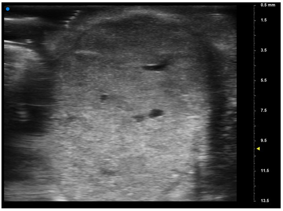 The high-frequency ultrasound depicts a well-defined round-shaped inhomogeneous hyperechoic lesion within the oral mucosa consistent with a mucoepidermoid carcinoma. The lesion exhibits regular borders and is confined to the deeper layers of the mucosa. There are heterogeneous areas within the lesion, reflecting mixed echogenicity, suggestive of varying tissue compositions. Surrounding tissues do not show any apparent signs of invasion.