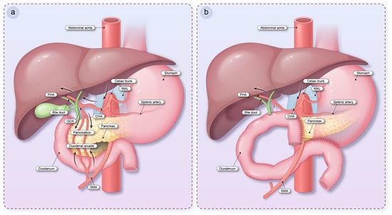 - Farma, J.M.; Hoffman, J.P. Nonneoplastic celiac axis occlusion in patients undergoing pancreaticoduodenectomy. Am. J. Surg. 2007, 193, 341–344. [Google Scholar] [CrossRef] [PubMed]
