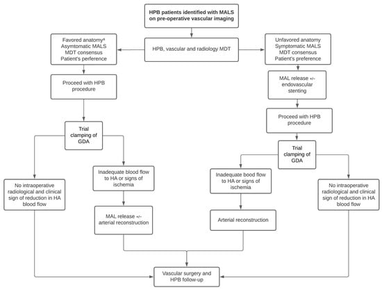 Lu LY, Eastment JG, Sivakumaran Y. Median Arcuate Ligament Syndrome (MALS) in Hepato-Pancreato-Biliary Surgery: A Narrative Review and Proposed Management Algorithm. Journal of Clinical Medicine. 2024; 13(9):2598. https://doi.org/10.3390/jcm13092598
