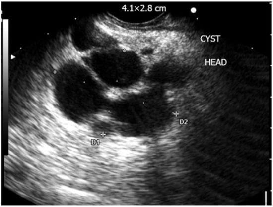 EUS showing complex multilocular cyst consistent with intraductal papillary mucinous neoplasm (D1 and D2: Dimensions of lesion) [35].