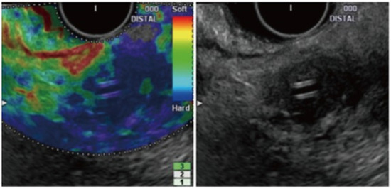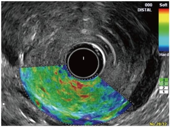 The difference between normal pancreatic tissue and pancreatic cancer in EUS elastography is shown in Figure 4 and Figure 5, respectively [57].