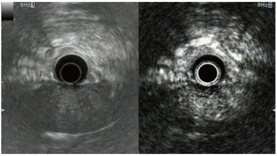 The linear-array EUS endoscope with a frequency of 7.5–10 MHz is most frequently used during CE-EUS as it can also be used for FNA to obtain tissue samples [65,66]. There are two main techniques of CE-EUS, which include contrast-enhanced endoscopic Doppler ultrasound with a high mechanical index (CHEMI-EUS) and contrast-enhanced low mechanical index EUS (CLEMI-EUS) [14]. During the procedure, when the EUS probe is near the area of interest, a bolus of microbubble followed by normal saline flush is injected into the patient [67]. The ultrasound processor uses a specific software that filters background tissue signals and produces only contrast-enhanced images [67]. Furthermore, as the contrast microbubbles have a small diameter (2.5 μm), their distribution is purely intravascular, enabling clear visualization of small blood vessels and high-resolution visualization of pancreatic parenchyma [67]. The difference between conventional EUS and CE-EUS is shown in Figure 6 [68].