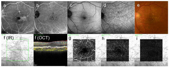 (a) FA image acquired at 6 min, diffuse fluorescence can be seen; (b) ICGA image, abnormal hypofluorescence contrast became clearer acquired at 13 min; (c) short-wavelength fundus autofluorescence image, it is hard to see abnormal fluorescence; (d) near-infrared autofluorescence image, abnormal hypofluorescence can be seen at the upper side above the fovea; (e) color fundus photograph, drusen can be seen at the macular area; (f) infrared + OCT angiography (horizontal section) through the drusen; (g) superficial vascular segment OCT angiography; (h) deep vascular segment OCT angiography; (i) avascular segment OCT angiography, (g–i) where there is no macular neovascularization.