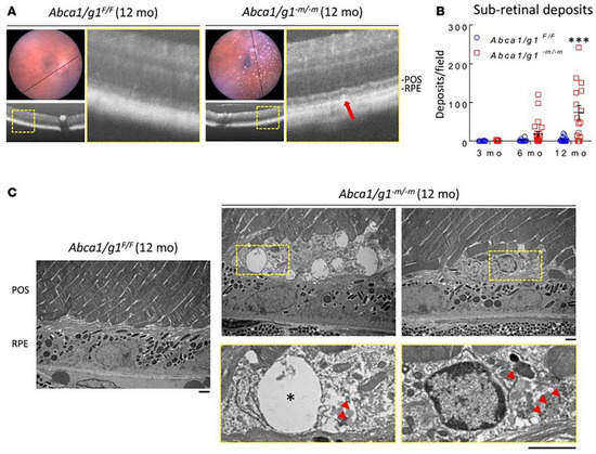 We generated conditional knock-out mice, wherein both Abca1 and Abcg1 were deleted in macrophages [46]. In this model, there was an age-dependent manifestation of several anatomic and functional AMD disease phenotypes, including subretinal deposits, increased Bruch’s membrane thickening, and accumulation of free cholesterol, cholesterol metabolites, and cholesteryl esters. In addition, this model also showed impaired dark adaptation and rod photoreceptor dysfunction [46] (Figure 3). Other macrophage depletion experiments suggest that blood-derived macrophages contribute to anti-VEGF resistance [47].