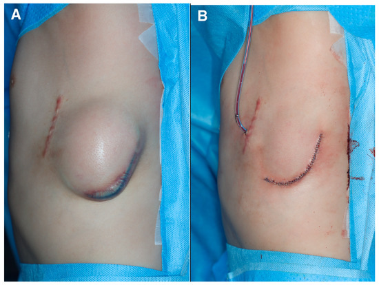 Initial intraoperative photographs. (A) Image depicting the impending state in which the implantable cardioverter–defibrillator (ICD) is descending, causing thinning of the chest skin and imminent external exposure. (B) Immediate postoperative photograph of ICD removal.