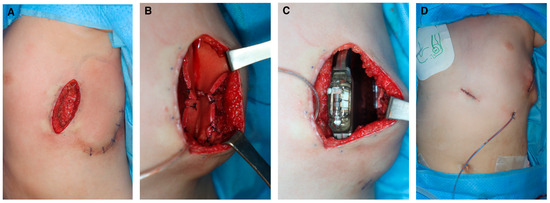 - Gill, R.; Kinsella, C.R., Jr.; Lin, A.Y.; Grunwaldt, L.J.; Jiang, S.; Deeney, V.F.; Losee, J. Acellular dermal matrix in the treatment and prevention of exposed vertical expandable prosthetic titanium ribs. Spine 2011, 36, E563–E567. [Google Scholar] [CrossRef]