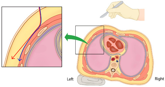 Transverse section of the thorax at cardiac level. Proper (blue arrow) and improper (red arrow) directions of subcutaneous dissection for subcutaneous ICD insertion. To ensure an adequate view inside the ICD pocket on the left lateral chest, it is advisable for a right-handed surgeon standing on the patient’s right side to tilt the patient 30 degrees to the right.