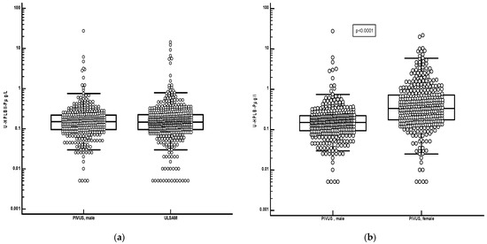 Panel (a) shows the urine concentrations of HPLBII-P in the male populations of the ULSAM and PIVUS cohorts. The urine concentrations were identical. Panel (b) shows the urine concentrations of HPLBII-P in males and females of the PIVUS cohort. The concentrations in the female population were significantly higher than in the male population (p < 0.0001, Mann–Whitney U-test).