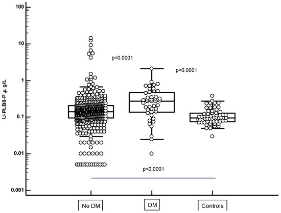 By means of our specific polyclonal antibodies, most human organ tissues were screened by immunohistochemistry for the expression of HPLBII-P [2]. Three organ tissues expressed the protein particularly well. These were neuronal cells, gastrointestinal and kidney tissues, in addition to bone marrow cells. By means of an ELISA, we measured HPLBII-P in gastrointestinal material and found interesting relations to GI diseases such as IBS [3] and IBD [2]. Our assay also allows for the measurement of the very low concentrations found in urine, and such measurements showed that in a cohort of COVID-19, this biomarker was closely related to acute kidney injury (AKI). We also observed in this cohort highly raised urine concentrations of HPLBII-P in a subgroup of patients with diabetes mellitus, which prompted us to investigate such a relationship further. For this purpose, we have measured HPLBII-P in urine in two community-based cohorts of elderly men and women, i.e., the ULSAM and PIVUS cohorts. The ULSAM study (the Uppsala Longitudinal Study of Adult Men) was initiated in 1969–1974 with a focus on the study of diabetes and cardiovascular disease [4]. The PIVUS cohort (The Prospective Investigation of the Vasculature in Uppsala Seniors (PIVUS) Study) was collected in the early 2000s and consisted of both males and females [5]. Our object was to compare the urine concentrations of HPLBII-P in these two cohorts to other currently used biomarkers of diabetes mellitus. The question that we raised was whether HPLBII-P might be a useful biomarker in urine for the management of diabetes mellitus.