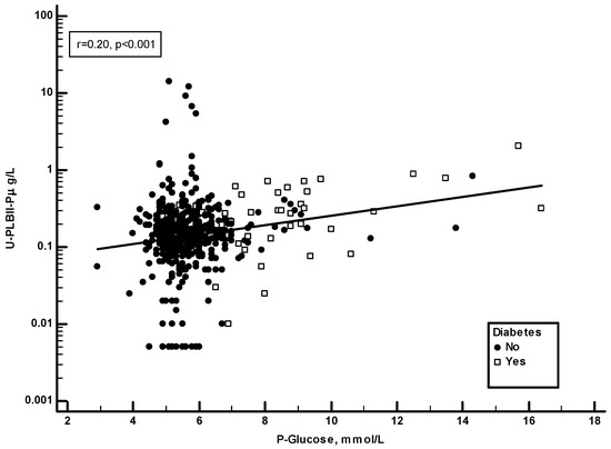 The correlation between plasma glucose concentrations and urine HPLBII-P concentrations in the ULSAM cohort (r = 0.20, p < 0.001). The results of the diabetic subjects are shown by the open squares.