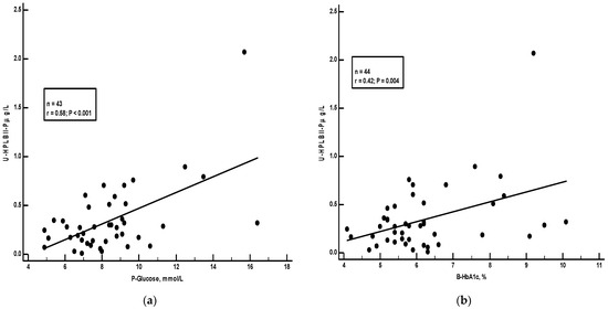 Panel (a) shows the correlation between plasma glucose concentrations and urine concentrations of HPLBII-P in the diabetic subpopulation of the ULSAM cohort. Panel (b) shows the correlation between blood HbA1c percentage and urine concentrations of HPLBII-P in the diabetic subpopulation of the ULSAM cohort. The statistics are given on the figure.