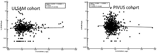 The correlations of the urine output of HPLBII-P and plasma concentrations of cystatin C. (Left) panel shows the results in the ULSAM cohort and the (right) panel the results in the PIVUS cohort. No correlations were apparent in the two cohorts.