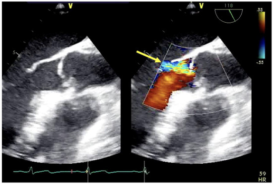 Aortic insufficiency (yellow arrow) demonstrated by TEE mid-esophageal long-axis view.