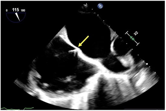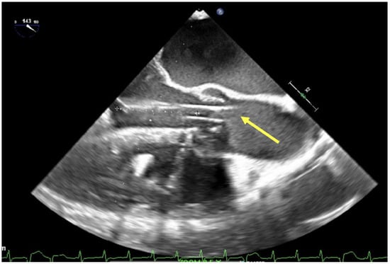 If left ventricular unloading is insufficient, placement of an LV vent is indicated and associated with increased probability of ECMO weaning and reduced mortality [28]. Echocardiography may be a useful guide in placement and management of LV vents, regardless of LV venting strategy. LV vents may be placed directly in the LV apex or left atrium (via pulmonary vein) under TEE guidance. In addition, LV venting may be achieved by inter-atrial septostomy. Septostomy is often guided by TEE, which facilitates visualization of interatrial “tenting” and may benefit from en-face 3D image guidance to aid interventionalists with fine intracardiac movements to avoid cardiac or vascular injury (Figure 4) [30]. Intra-aortic balloon pulsation (IABP) is another often utilized strategy to address LV distension via reduction in systemic afterload, and when utilized with ECMO, may improve femoral arterial blood flow rates and overall survival compared with ECMO therapy alone. TEE guidance has been described to guide appropriate placement. IABP guidewire should be visualized 1–2 cm below the left subclavian artery takeoff, and views should confirm absence of new cardiac injury, aortic dissection, or interference with atheromatous disease [31,32,33]. Finally, the LV Impella (Abiomed) is a miniaturized left ventricular assist device which provides continuous drainage of left ventricular blood flow to the ascending aorta. It is often utilized in conjunction with ECMO therapy to provide both LV unloading as well as a transitional form of mechanical circulatory support following ECMO decannulation, and it has been associated with improved survival when utilized in conjunction with ECMO vs. ECMO support alone [34]. TEE is frequently utilized to guide Impella placement, and should demonstrate the Impella tip 3.5–5.5 cm (depending on Impella version) from the aortic annulus on the ventricular side of the aortic valve, as well as confirm absence of consequent aortic dissection, cardiac tamponade, or new aortic valve or mitral valve dysfunction, or patent foramen ovale [35] (Figure 5).