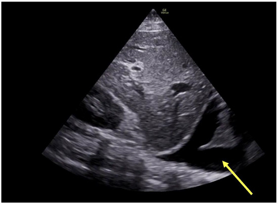 Acute or chronic worsening of lung processes may also cause worsening hypoxemia and/or acute RV dysfunction with consequent remodeling of the pulmonary vasculature [40]. POCUS has been well described as a sensitive exam for detecting new pneumothorax (visualization of “lung point”), hemothorax or large pleural effusion (Figure 7), or consolidation [26]. In addition, cardiac POCUS and/or TEE has been utilized in ARDS patients to detect and grade severity of new acute RV dysfunction, evidenced by RV dilation, estimated pulmonary artery pressure, septal dyskinesis, and RV hypertrophy, which may have implications regarding pharmacologic and/or ventilatory strategy, in addition to prognosis [40].