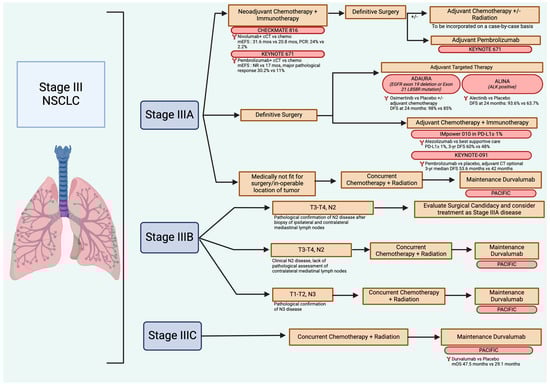 Patients with stage IIIA NSCLC disease include those with T3/T4, N0/N1 disease and T1/T2, N2 disease (Figure 2). Clinicians evaluating patients with stage IIIA disease should assess whether the patients are medically optimal candidates for thoracic surgery, taking into account their overall health, comorbid conditions, and lung reserves. If patients are medically and surgically fit to undergo surgery, those with T3/T4, N0/N1 disease can be considered for neoadjuvant chemo-immunotherapy for three cycles with carboplatin/paclitaxel and nivolumab followed by response assessment [81]. Those with a clinical response can proceed to surgery followed by an option for adjuvant chemotherapy after a multidisciplinary discussion between surgery, medical oncology, and radiation oncology. Neoadjuvant chemo-immunotherapy followed by adjuvant pembrolizumab is also an option based on the KEYNOTE-671 data and is also part of standard-of-care recommendations [84].