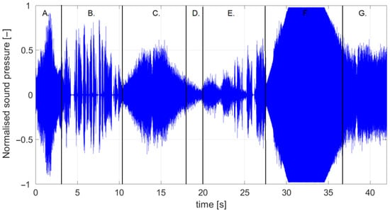 The appearance of the audible sound signal perceived by the subjects: A. vuvuzela, B. fork, C. chainsaw, D. ambulance, E. styrofoam, F. screech, and G. grinder.