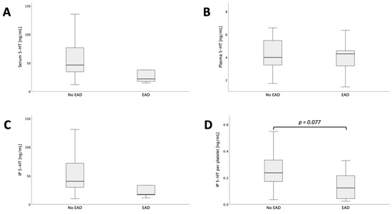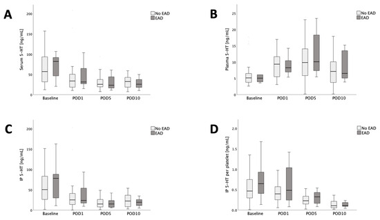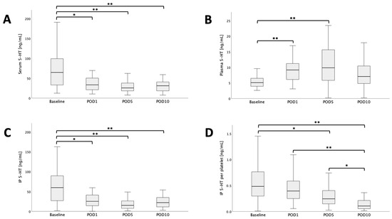 | Serum 5-HT [ng/mL] | 64.8 (31.7–103.1) n = 44 | 33.4 (19.0–51.2) n = 43 | 25.7 (17.6–38.5) n = 43 | 31.1 (18.1–41.2) n = 42 |