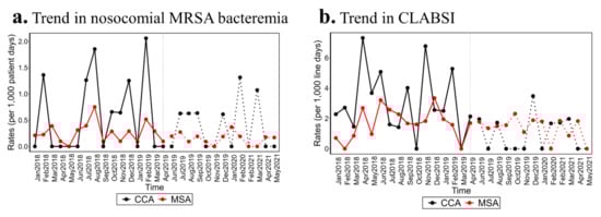 Nosocomial MRSA bacteremia and CLABSI rates in CCA and MSA January 2018–June 2021. (a): Temporal trends in the number of nosocomial MRSA bacteremia per 1000 patient days before and after the intervention periods. (b): Temporal trends in the number of CLABSI per 1000 line days before and after the intervention periods. (a,b) are the raw counts divided by the patient days or line days for each month.