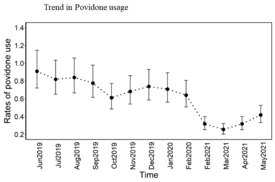 Povidone Iodine usage in CCA: Temporal trends in the usage of povidone iodine adjusted for length of stay for each month.