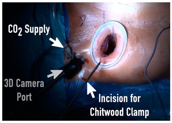View of the surgical field with right anterior mini-thoracotomy (RAMT) via the third intercostal space with the soft tissue retractor, the 3D camera port, the incision for the Chitwood aortic clamp, and the CO2 supply.