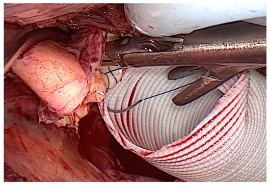 After removing the AA, polypropylene stay sutures were placed to exposure the aortic valve. The leaflets were excised, and in the case of calcified valves, a debridement of the annulus was performed. According to actual ESC/EACTs guidelines and patients’ wishes, biological aortic valves were implanted in all patients [27]. The size of the prosthesis was based on intraoperative measurement using the according valve sizer. For AVR, pledgeted mattress annular sutures were placed using the automatically RAM®suture device (RAM® COR-SUTURE® QUICK LOAD®, LSI Solutions, Victor, NY, USA) starting with the base of the non-coronary cusp, followed by the left coronary cusp, and finally the right coronary cusp, respectively. Before the introduction of the RAM® suture device (RAM® COR-SUTURE® QUICK LOAD®, LSI Solutions, Victor, NY, USA) into our routine practice, annular sutures were traditionally placed manually using interrupted non-everted pledgeted mattress sutures, starting at the base of the left coronary cusp and proceeding in a clockwise fashion. An automatic knot-tie device (Cor-Knot®, LSI Solutions, Victor, NY, USA) was used to tie the knots of the aortic valve prosthesis. After finishing the AVR, the supracoronary AA was replaced using the same technique described above (Figure 3).
