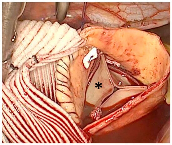 Surgical view from the 3D camera during completion of the proximal anastomosis after finishing the aortic valve replacement with biological prosthesis (*).