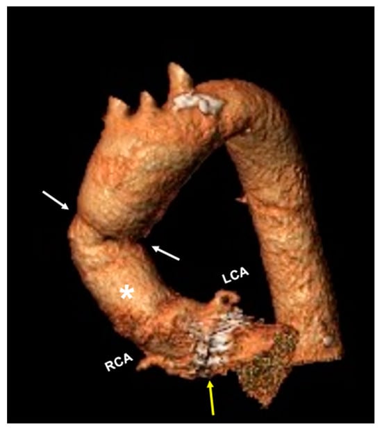 Postoperative CTA examination and three-dimensional reconstruction indicated a successful Bentall procedure with replacement of the ascending aorta (white asterisk), the aortic root, and the aortic valve (yellow arrow) with reimplantation of left and right coronary artery (LCA and RCA). Distal anastomosis is indicated by the white arrows.