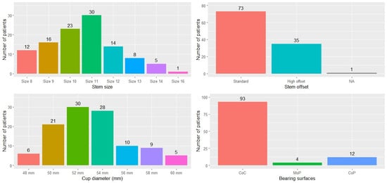 The implants used in the different procedures are shown in Figure 4. The most common stem size was size 11, with 73 (67.0%) stems featuring a standard offset design and 35 (32.1%) an extended offset design. As regards the cup, the most commonly used diameters were 52 mm (N = 30; 27.5%), 54 mm (N = 28; 25.7%), and 50 mm (N = 21; 19.3%), followed at great distance by the remaining sizes. The most commonly used bearing surface was ceramic-on-ceramic (CoC; N = 93; 85.3%), followed by ceramic-on-polyethylene (CoP; N = 12; 11.0%) and metal-on-polyethylene (MoP; N = 4; 3.7%).