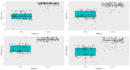 The evolution of the patients’ clinical status between the preoperative period and the sixth month post-op, as measured by the MDP scale, is summarized in Table 2 and Figure 5. Both the overall assessment and the three MDP subscales (pain, gait, and mobility) showed a considerable (and statistically significant) clinical improvement (p < 0.001).