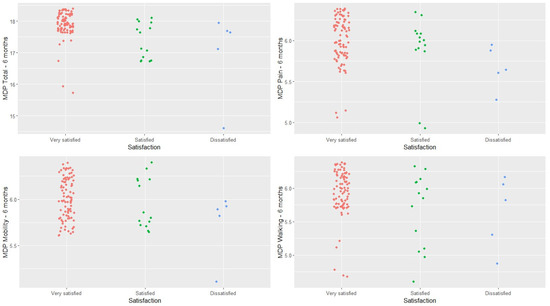 A connection was also found between patient satisfaction and some of the scores on the MDP scale at 6 months (not considering the baseline scores). More specifically, statistically significant differences were found between the different levels of satisfaction reported by patients and their overall MDP score. A statistically significant difference was observed (p < 0.001) between “highly satisfied” and “satisfied” patients as well as between “highly satisfied” and “dissatisfied” patients (p = 0.016). No differences were observed (p = 0.087) between the different levels of satisfaction and the scores obtained on the MDP pain subscale. As regards the mobility subscale, differences were observed (p < 0.001) between the “highly satisfied” and the “dissatisfied” group. Significant differences were also found in terms of the MDP gait subscale. Such differences were observed between the “highly satisfied” and “satisfied” groups (p = 0.001) and the “highly satisfied” and “dissatisfied” groups (p = 0.009).