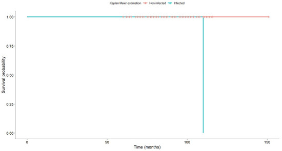 Implant survival according to the Kaplan–Meier methodology. A distinction is made between infected and non-infected prostheses.