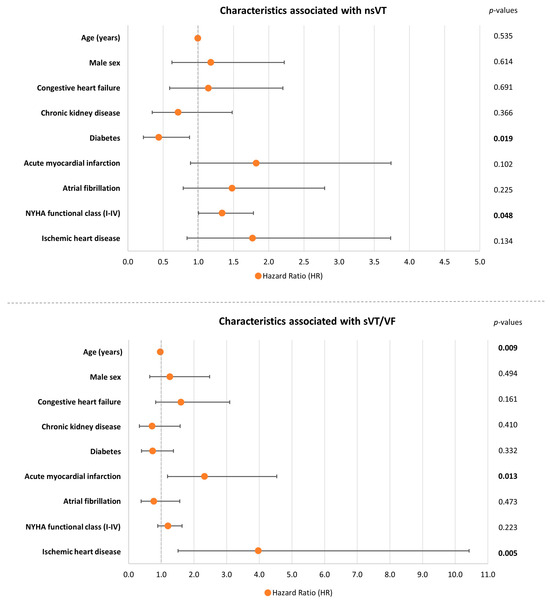 Forest plots demonstrating logistic regression analyses to identify patient characteristics associated with nsVT (upper panel) and sVT/VF (lower panel) with corresponding hazard ratios (scatter points) and 95% confidence intervals (error bars). Level of significance p ≤ 0.05. Bold type indicates statistical significance.