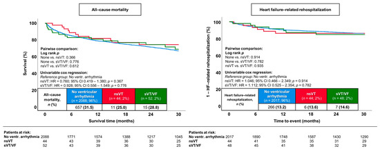 The occurrence of nsVT (HR = 0.760; 95% CI 0.419–1.380; p = 0.367) and sVT/VF (HR = 0.928; 95% CI 0.556–1.549; p = 0.776) did not impact patients’ prognosis with regard to the primary endpoint of long-term all-cause mortality when compared to patients with HFmrEF who did not experience ventricular tachyarrhythmias (25.0% and 28.8% vs. 31.5%; log-rank p ≥ 0.366) (Figure 2, left panel). Similar results were observed for the secondary endpoint of long-term HF-related rehospitalization (log-rank p ≥ 0.782) (Figure 2, right panel). Regarding additional secondary endpoints and follow-up data, the duration of ICU stay was higher in the nsVT and sVT/VF groups (2 days and 1 day vs. 0 days; p ≤ 0.001 for all comparisons). However, no significant differences in the other secondary endpoints were observed, with the exception that in-hospital cardiovascular mortality was more frequently observed in patients with HFmrEF and sVT/VF compared to those with HFmrEF but without ventricular tachyarrhythmias (7.7% vs. 1.5%; HR = 4.587; 95% CI 1.618–13.003; p = 0.004) (Table 4).
