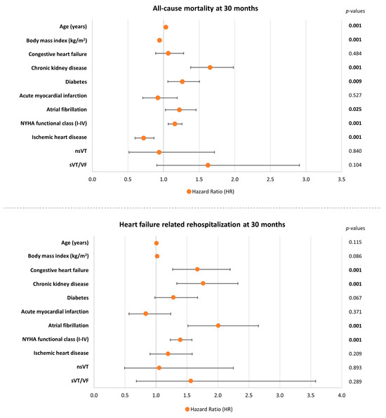 Forest plots demonstrating multivariable Cox regression analyses within the entire study cohort regarding the risk of long-term all-cause mortality (upper panel) and HF-related rehospitalization (lower panel). Level of significance p ≤ 0.05. Bold type indicates statistical significance.