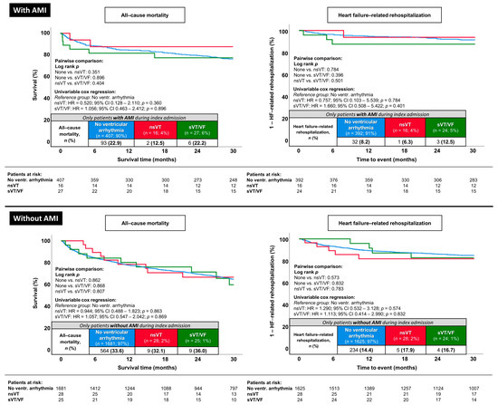 As demonstrated in Figure 4, the occurrence of nsVT and sVT/VF also did not impact long-term all-cause mortality (log-rank p ≥ 0.351 for all comparisons) or HF-related rehospitalization (log-rank p ≥ 0.396 for all comparisons) in analyses selectively investigating subgroups stratified by the incidence of AMI during the index admission. Furthermore, multivariable Cox regression analyses were performed in these subgroups (i.e., AMI and non-AMI subgroups; Figure 5). Similar to the results observed in the entire study population (3.4), nsVT and sVT/VF were also not associated with the risk of long-term all-cause mortality when performing multivariable adjustment in subgroups exclusively composed of HFmrEF patients with (nsVT: p = 0.799 and sVT/VF: p = 0.075) or without AMI (nsVT: p = 0.880 and sVT/VF: p = 0.463) during the index admission (Figure 5, left column). In addition, nsVT and sVT/VF were not associated with long-term HF-related rehospitalization in the subgroup without AMI. However, analysis in the subgroup of patients with AMI during the index admission showed a higher risk of HF-related rehospitalization in patients experiencing sVT/VF (HR = 3.716; 95% CI 1.060–13.030; p = 0.040) (Figure 5, right column).
