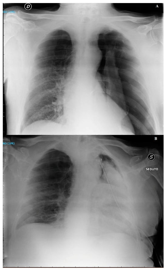The clinical presentation of re-expansion pulmonary edema can vary widely, ranging from cases with a positive radiological finding but clinically asymptomatic, to severe forms causing cardiorespiratory failure and circulatory shock. In a significant number of cases, re-expansion pulmonary edema is an asymptomatic or self-limiting condition that does not require any intervention. Patients with symptomatic re-expansion pulmonary edema typically experience rapidly progressive dyspnea and tachypnea, usually occurring within 1 h after lung expansion intercostal drainage. Additional symptoms may include a productive cough, tachycardia, hypotension, fever, chest pain, nausea, and vomiting [20]. The largest proportion of patients develop re-expansion pulmonary edema within 2 h of lung expansion, with all cases manifesting within 24 h [7]. The early recognition of the clinical picture of re-expansion pulmonary edema is important for initiating prompt management and allowing for a favorable outcome. However, in some instances, signs and symptoms may worsen despite treatment, leading to fatalities. Mortality has been reported in several papers. In the earliest studies about re-expansion pulmonary edema, the mortality rate was higher than 20% [7]; however, more recent studies have found this value to be significantly lower, indicating potential overestimation in earlier assessments [14]. These findings suggest that re-expansion pulmonary edema is a more common, transient, and generally benign phenomenon than was previously thought. Radiographic features show a unilateral alveolar filling pattern visible within 2–4 h after re-expansion. Typically, in the case of pneumothorax, the first control performed immediately after chest drain placement is normal, and radiological signs of edema appear one hour later. The edema often progresses over 48 h toward the complete white-out of a hemithorax on the chest X-ray (Figure 1) with persistence for 4–5 days before resolving in a few days, leaving no lasting radiographic abnormalities. On the CT scan, the most common findings include ipsilateral consolidation, ground-glass opacity, intralobular interstitial thickening, interlobular septal and bronchovascular bundles thickening [21] (Figure 2A,B).