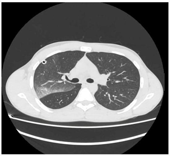 After the procedure, the patient complained of an initially dry cough, later accompanied by the expectoration of clear mucus, followed by severe dyspnea, tachypnea, and tachycardia. There was no evidence of significant air leakage from the chest drain. Immediate treatment included O2 therapy with a Venturi Mask with 35% FiO2, diuretics, bronchodilators, and steroids. Blood gas analysis was performed showing pH 7.49; PaCO2 = 29 mmHg; PaO2 = 58 mmHg; bicarbonate 26 mM; and SaO2 91%. A CT scan confirmed right re-expansion pulmonary edema with alveolar filling and a consolidative area with an air bronchogram (Figure 6).