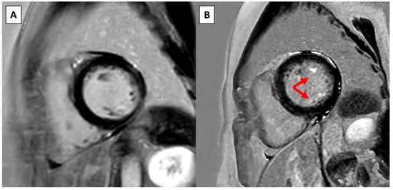 Example of new LGE on serial CMR in a patient with surgical intervention. (A) Short-axis view on baseline CMR. (B) Short-axis view at the same level within 1 year shows new LGE in the basal inferolateral left ventricular wall (red arrow) and diffuse pericardial enhancement.