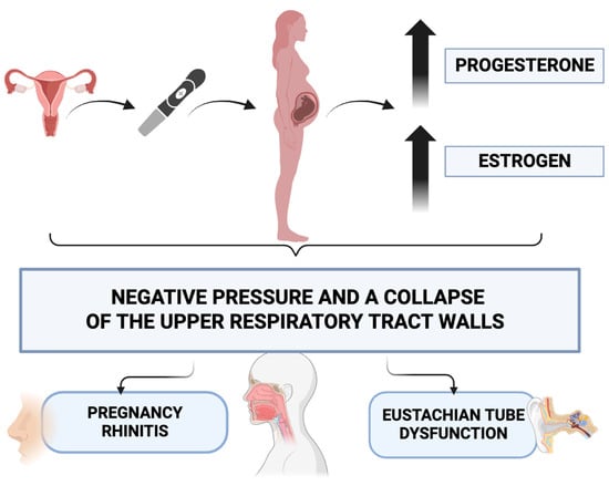Pregnancy entails significant transformations in a woman’s body, with the majority of these changes posing no harm to the mother or fetus. However, some alterations can give rise to pathological manifestations. Levels of estrogen and progesterone undergo a continuous rise throughout pregnancy, reaching their highest point in the final trimester, and subsequently decline shortly after childbirth [3]. Estrogen and progesterone are responsible for the increased permeability of vessel walls and the relaxation of smooth muscles in vessels, causing an increase in negative pressure and a collapse of the upper respiratory tract walls, and certain clinical manifestations are observed in the head and neck region [4]. These clinical symptoms encompass issues such as epistaxis, rhinitis, otological disorders, and alterations in voice [5,6,7]. The aforementioned physiological changes occurring during pregnancy, affecting the upper respiratory tract, contribute to a deterioration in the quality of life for pregnant women (Figure 1). Nasal obstruction and torus tubarius swelling result in pregnancy rhinitis and secondary Eustachian tube dysfunction, leading to hearing loss and discomfort related to ear congestion caused by negative pressure in the middle ear.